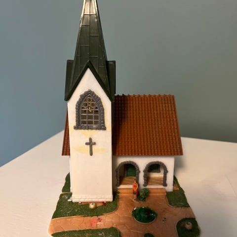 Flott Julekirke med spilledåse og lys. Alt fungerer. 40 cm høy, 30 cm lang og 14 cm bred. Kan også sendes med PostNord til 69kr.