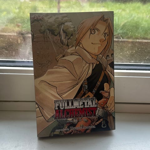 Fullmetal Alchemist manga, volumene 1 til 3. Serien følger historien om to brødre som bruker alkymi i en fantasyverden. Bøkene er på engelsk og utgitt av VIZ Media.