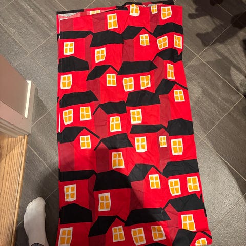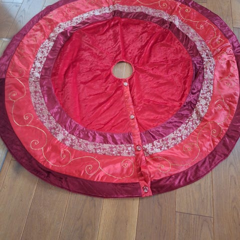 Juleteppe til juletre selges i flott kvalitet til og med fine detaljer i rødt, grønt og gull. Teppe er kun brukt en jul, men det har dessverre noen små dråper med stearin som mest sannsynlig kan fjernes med strykejern og papir.