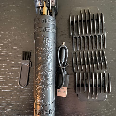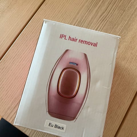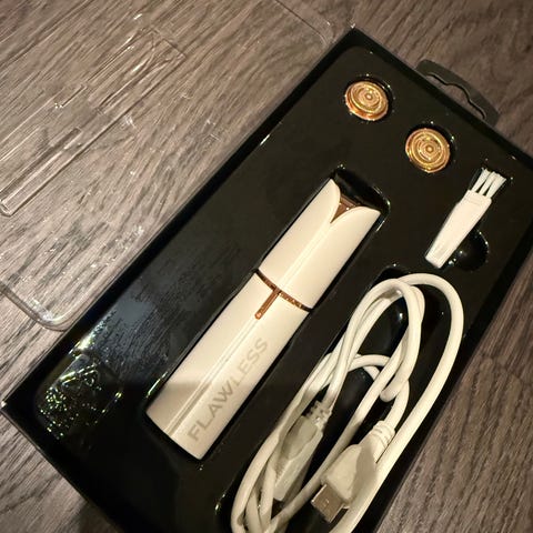 Hårfjerner enhet i hvit farge med tilhørende lader og ekstra tilbehør. Enheten har et ergonomisk design og er beregnet for personlig pleie.