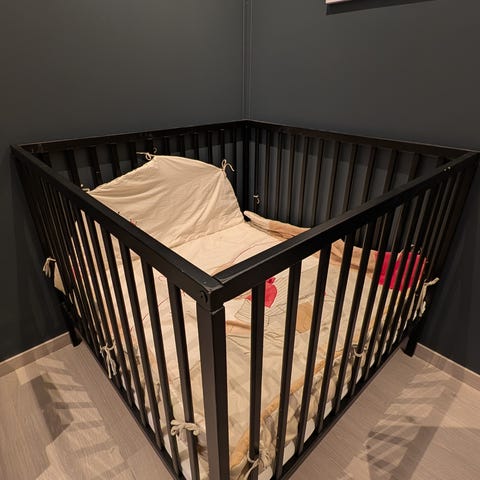 Madrass med avtagbart trekk følger med, men trekket har krympet litt i vask slik at madrassen er litt bølgete. Se bilde. Dette kan sikkert fikses ved å klippe litt av madrassen eller prøve å strekke trekket litt.