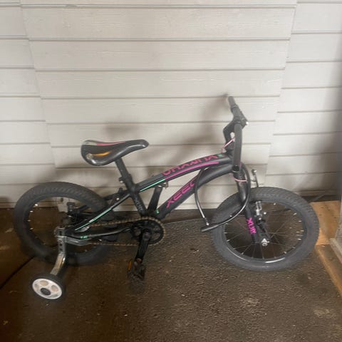 DBS BMX barnesykkel med 16 tommers hjul, svart ramme med blå detaljer. Sykkelen har håndbremser og er designet for barn.