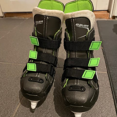 Bauer ishockeyskøyter for barn i størrelse 29. Skøytene er laget for ishockey og har svart og hvit farge.