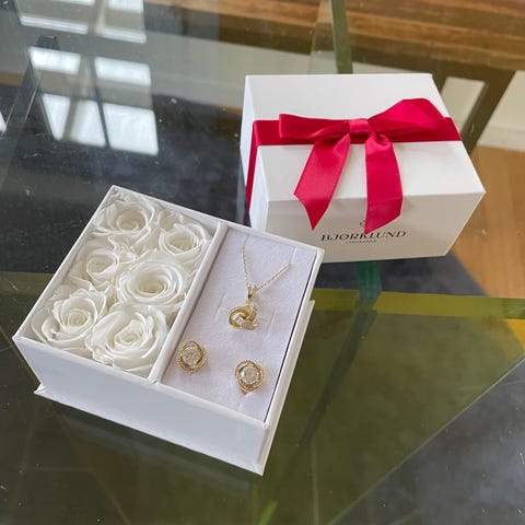***Prisen inkluderer blomster og sjokolade. Kontanter eller andre gaver må leveres eller betales på forhånd, slik at de kan legges i boksen før overlevering.