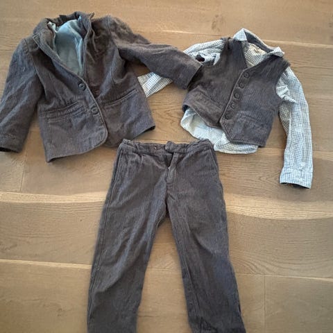 Benetton grå blazer, grå penbukse fra Marcs & Spencer og Pascal skjorte med rød vest og sløyfe str 110-116. Flott antrekk både til jul og 17. mai, konfirmasjoner osv. kun brukt 1-2 ganger av ett barn.
