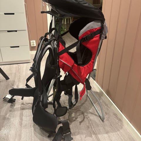 Bergans Barnestol Ryggsekk i rød farge. Designet for bæring av barn med justerbare stropper og polstret rygg for komfort. Utstyrt med støtteben for stabilitet når den settes ned. Egnet for utendørs bruk og turer med barn.