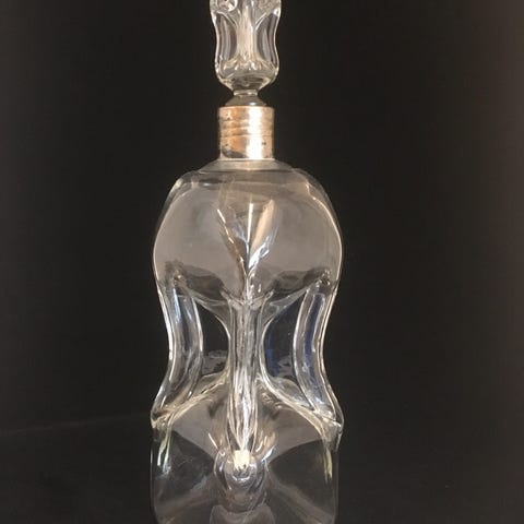 Klunkeflaske (karaffel) i klart glass. Karaffelen har en rund kork og en klassisk design. 27 cm høy