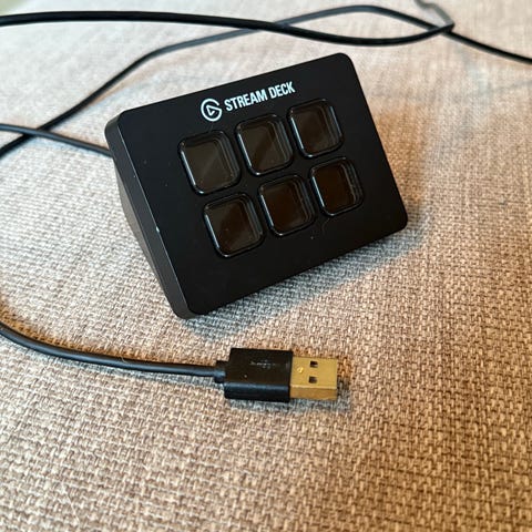 Elgato Stream Deck kontrollpanel med 15 programmerbare LCD-taster. Enheten er kompatibel med Windows og Mac, og brukes til å effektivisere arbeidsflyt ved å tilpasse snarveier for streaming, redigering og andre oppgaver. Kontrollpanelet har et kompakt design og gir mulighet for enkel tilpasning av funksjoner.
