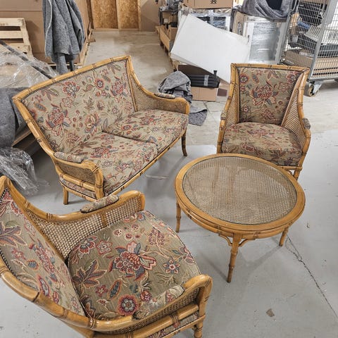 Rokokko/Louis XV‑stil salong – 3‑seter + 2 lenestoler + marmorbord