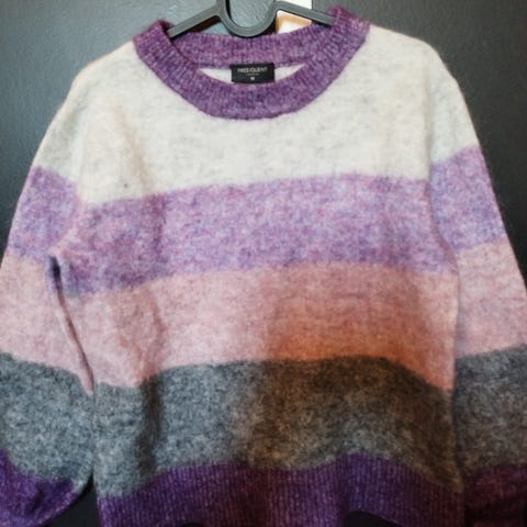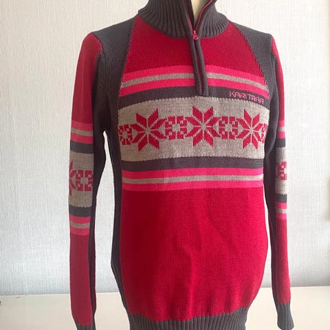 Genseren har flerfarget mønster og er laget i ullmateriale, egnet for kaldere vær.