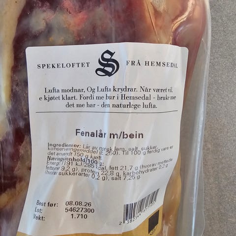 Jens Eide Fenalår lam. Produktet er pakket og merket med informasjon om opprinnelse og næringsinnhold.