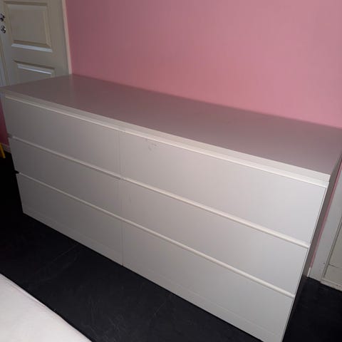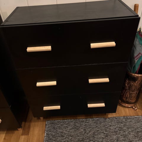 Litt svake flekker i noen av skuffene(er vasket). Skuffene glir litt tregt, og kommoden mangler en knott/fot på venstre side bak(har løs klosse som er brukt som erstatning)