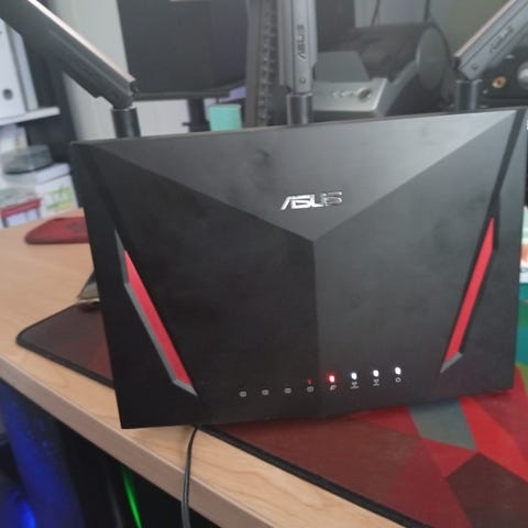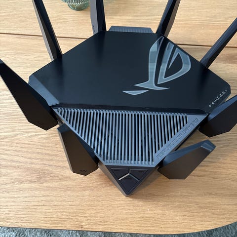 ASUS ROG Rapture GT-AC5300 Router med flere LAN-porter, USB-port, og indikatorlys for strøm, internett og tilkoblinger. Svart farge med røde detaljer. Designet for høy ytelse innen nettverksforbindelse. Byttet antenner med uorginale antenner pg dårlig kvalitet på de orginale.
