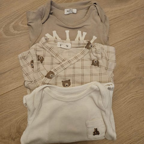 Tre barnebodyer med bukser + 2 barnesoveposer