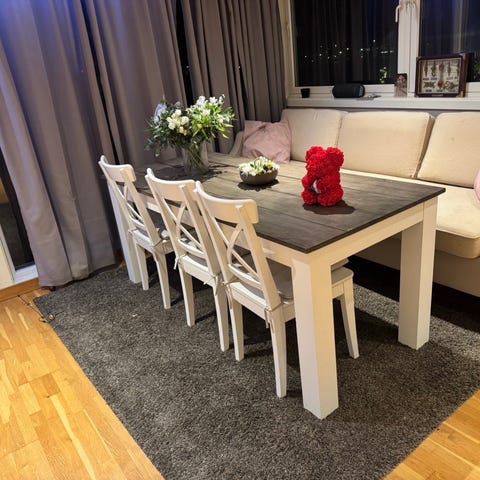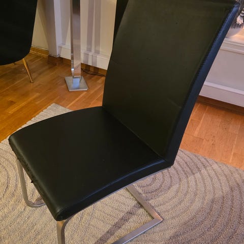 Hvite stoler selges for en billig penge. 500 kr totalt for alle åtte stolene.