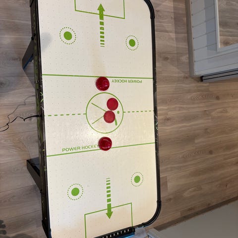 Kjøpt nytt i 2023 og pent brukt. Ingen skader, bortsett fra at festet på det ene målet er knekt (kan evnt forsøkes limes på igjen; spillet fungerer fortsatt, men brikken faller på gulvet når man får mål), samt litt lett overflateslitasje.