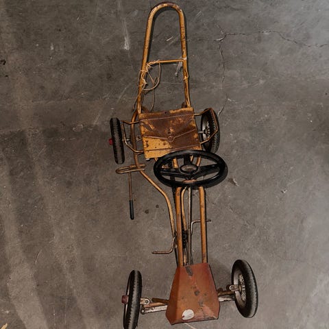 Usikker på merke og alder, men den er over 60 år gammel ihvertfall. Har mange timer i denne som barn. Fungerer som den skal. Ser på andre lignende tråbiler at pris varierer fra 1800,- og oppover.
