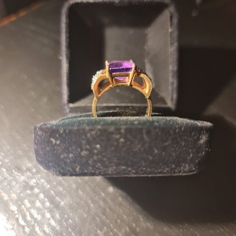 Dyp rød granat i gull – omgitt av 12 brilljanter