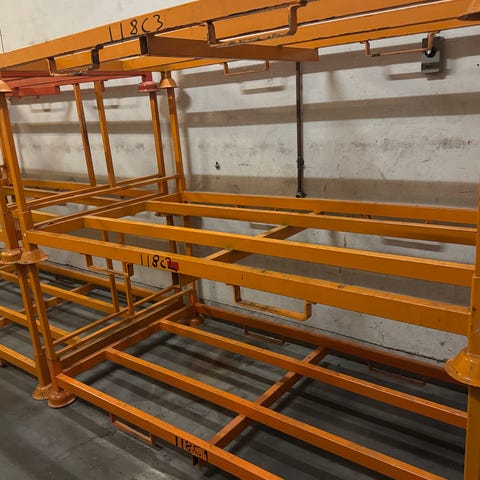 Metallrør og beslag i stål med grå overflate. Inkluderer forskjellige rørdeler og festemateriell som skruer og klemmer. Garasjetelt ramme med noe bøyd deler. Selv telt er ødelagt og kastet.