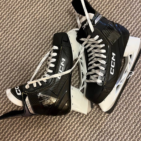 CCM ishockeyskøyter i størrelse 41. Skøytene er designet for ishockey og har svart farge med detaljer i rødt og hvitt. Egnet for bruk på is for ishockeyspillere.