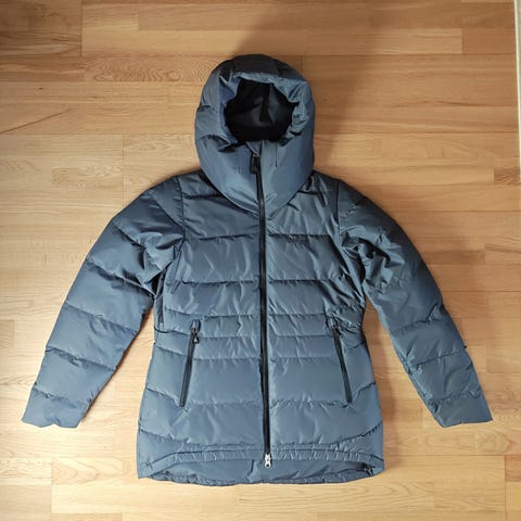 Haglöfs Annet dunjakke for dame i størrelse M. Jakken har en kombinasjon av fargene grå og oransje, med fyll av dun som gir isolasjon. Egnet for utendørs bruk og sportsaktiviteter.