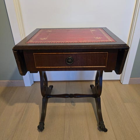 Antikk Gammelt klaffbord/bondebord med to velfungerende klaffer. Bordet ser fantastisk ut i virkeligheten og er i flott stand tross alder,praktisk skuff. Meget plassbesparende kjøkkenbord. Kan brukes ogsp som avlastnings/sidebord eller på kontoret som skrivebord/arbeidsbord.