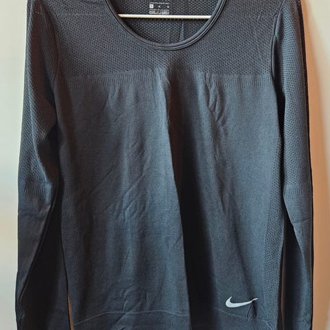 Nike treningsoverdel i størrelse M, svart farge. Designet for fitnessaktiviteter med langermet passform. Helt ny. Vaskes på 30 grader.