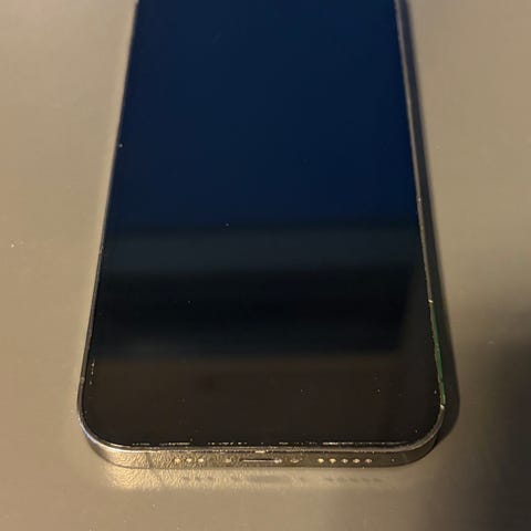 Apple iPhone 12 Pro mobiltelefon med 128 GB lagringskapasitet. Telefonen har en skjerm med kant-til-kant-design og flere kameraer på baksiden. Enheten har en mørke blå farge og en robust konstruksjon med flat ramme. Som du kan se på bildene er det noen skader foran på skjermen. Selges fordi jeg har kjøpt ny.