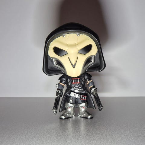 Funko Pop Reaper figurine med svart hette og hvitt ansikt. Figuren har detaljer som våpen og rustning, og representerer overwatch karakteren Reaper.