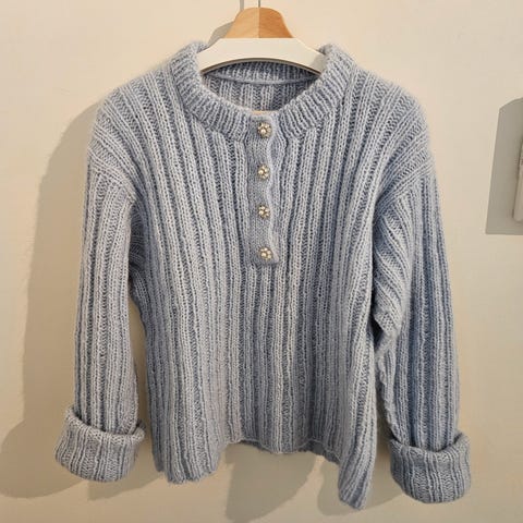 Nydelig jakke etter mønster fra Petiteknit, Esther jacket. Strikket i Drops Nepal i en dueblå farge.