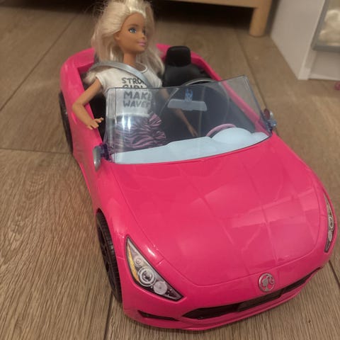 Lite brukt Barbie lekebil i rosa med detaljer i lilla og blått. Inkluderer to Barbie-dukker med ulikt antrekk. Passer til lek og samling.