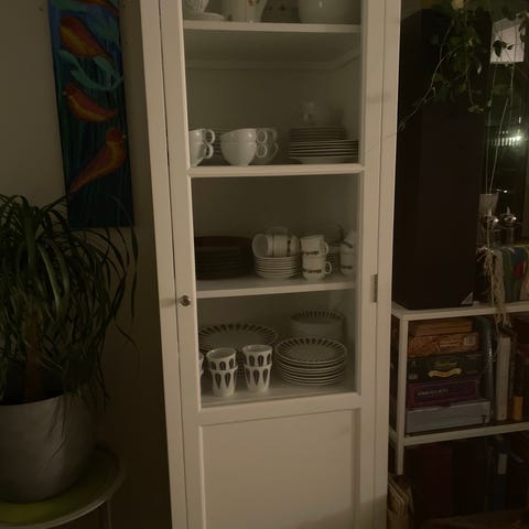 Selger et pent brukt BESTÅ vitrineskap fra IKEA med nye skap dører i mørk furu og glass dører. Glassplate i høyglans på toppen. Innvendige hyller i alle skap. God oppbevaringsplass.