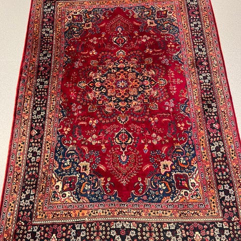 Persisk håndknyttet teppe av ull. Slitasje på frynser i den ene enden, samt hjørnet samme side. Teppet bør bankes og renses. Oppgitt mål er med frynser.