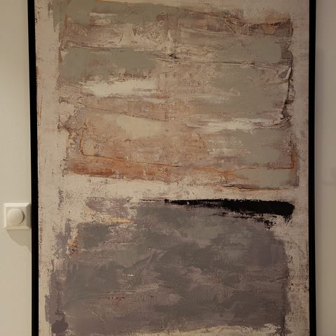 Abstrakt maleri med jordfarger og tekstur. Kunstverket har en kombinasjon av brune, hvite og grå toner, og viser en sammensetning av geometriske former og linjer. Passer til dekorasjon i ulike rom.