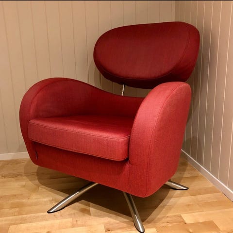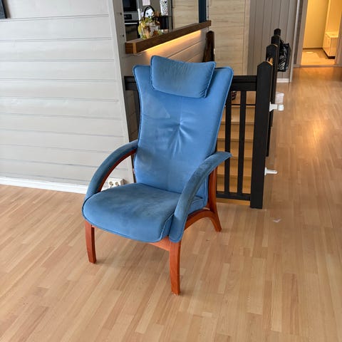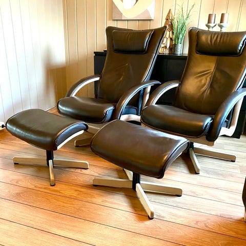 Selger en pent brukt Brunstad delta med valnøtt-farget eikeramme og sort skinn inkl fotskammel. Fremstår som meget pen, med et par merker i skinnet i venstre armlene og på fotskammel (se bilder).