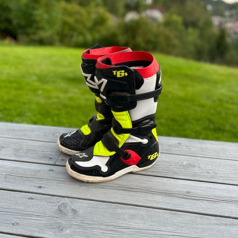 Alpinestars motorsykkelstøvler i størrelse 42. Støvlene har en kombinasjon av hvit og svart farge. Designet for beskyttelse og komfort ved motorsykkelkjøring.
