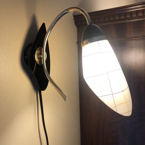 Uttrekkbar vegglampe i "gull" utførelse selges. Noe misfarget på sokkel. Skjerm trenge en rens, evt. ny skjerm. Kan sendes.