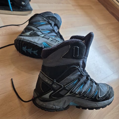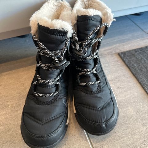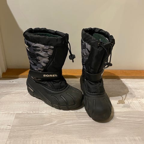 Sorel barn vintersko i størrelse 32, unisex. Skoene er designet for å gi beskyttelse og varme i kalde forhold.