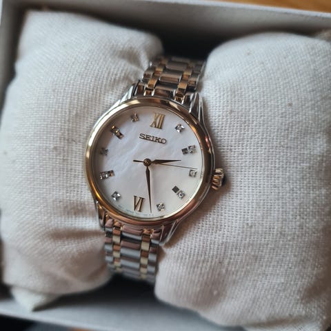 Seiko Presage Dame klokke i stål. Klokken har en rund urskive med datoindikator og er designet for damebruk.