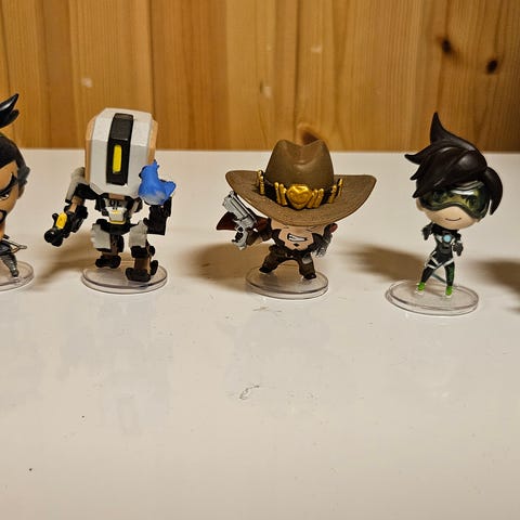 Dette er samlerfigurer av typen "Cute But Deadly" fra Overwatch-spillet. Karakterene som vises er (fra venstre til høyre): Reaper, Soldier: 76, D.Va, og Hanzo. De avbildede figurene er spesifikt fra Series 3-kolleksjonen.