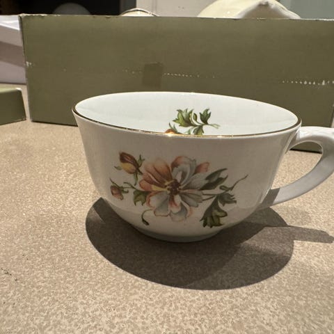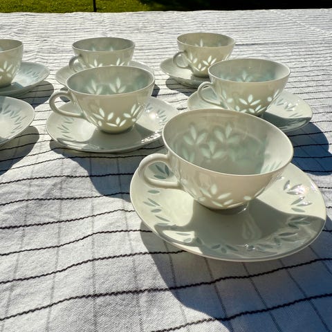 Koppen og skålen har dekorative mønstre og er produsert av Arabia, kjent for god kvalitet.