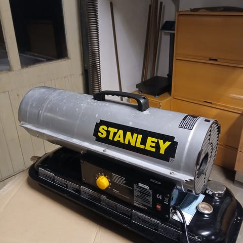 Dantherm industrivarmeovn fra 1982 med kontrollpanel, justerbare innstillinger og ventilasjonssystem. Enheten er konstruert for oppvarming i industrielle miljøer og har en robust metallkonstruksjon med luftutslipp og tilkoblinger for strømforsyning.