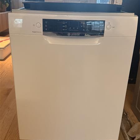 Bosch oppvaskmaskin. Produktet er hvitt og har et innvendig oppvasksystem med bestikkurv og flere kurver for oppvask. Kontrollpanelet har knapper for ulike programmer og innstillinger. Maskinen er egnet for bruk i kjøkken for oppvask. Kan hentes snarest mulig. Selger pga flytting
