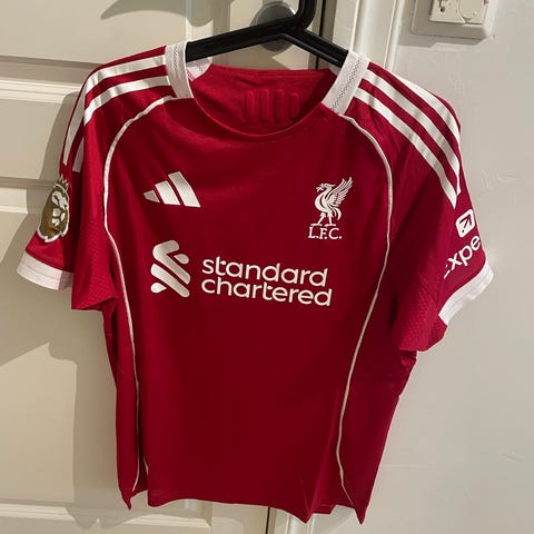 Liverpool fotballdrakt i størrelse M, grønn farge. Drakten har Premier League-logo og Liverpool Football Club-emblem. Laget i Thailand. Drakten er kjøpt på DH gate. Spiller versjon stoff.