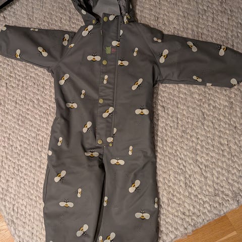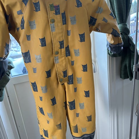 Kattnakken foret regndress selges. Godt brukt, men mye bruk igjen hvis man lapper litt på knærne. Barnet har blitt våt på knærne ved siste bruk og det observeres små hull på knærne. Se bilder.