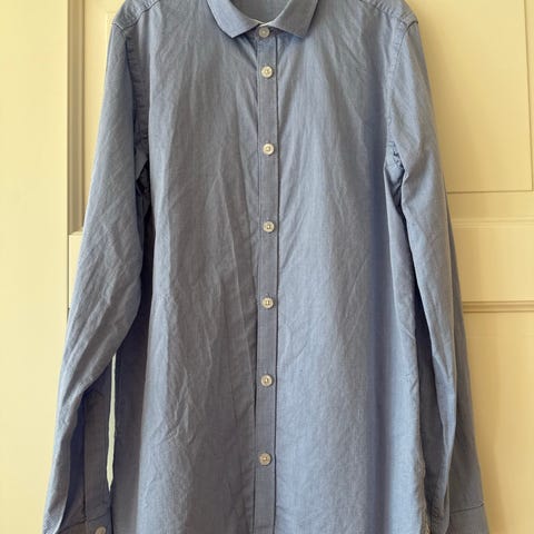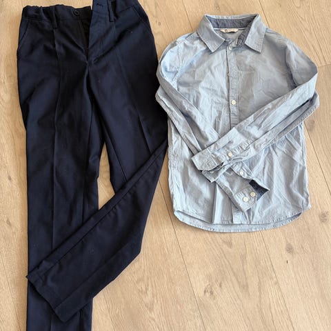 Mørk blå ull Mario Conti (fra Match /Vic ) penbukse str B2-42,lys blå skjorte med hvite striper merke Tom Taylor str 152. Hvit 100% bomull skjorte fra H&M str 152. Svært pent brukt.