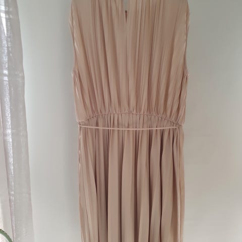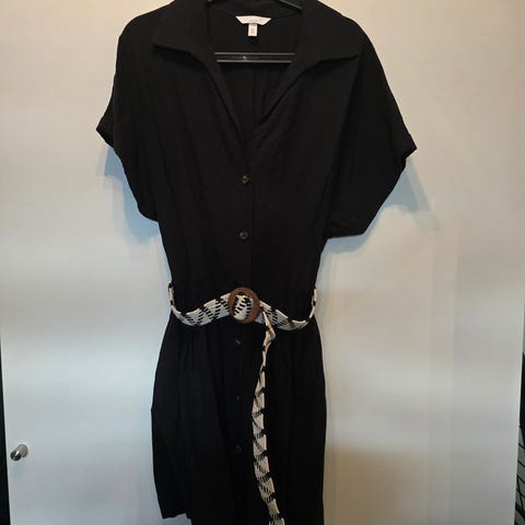 En kort, figurnær kjole i myk, finstrikket kvalitet med kontrastfargede kanter. Rund hals, metallknapper foran, korte ermer og passpolerte fuskelommer med knapp foran og på brystet.