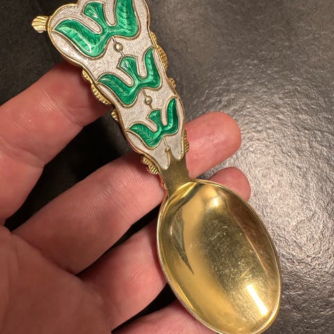 Det er et eksempel på norsk emaljesølv, ofte laget av kjente gullsmeder som David Andersen eller Hroar Prydz.