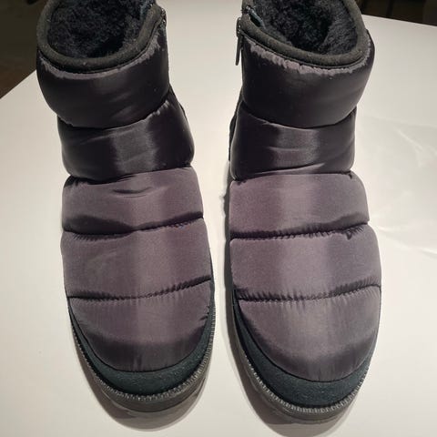 Råtøffe UGGS i størrelse 40 med svart sensket skinn og hvitt, mykt fôr. Skoene har lukking med glidelås på innsiden. Passer for bruk i kaldt vær med isolerende fôr. Passer til størrelse 39 også. De er gode å gå i på tross av de høye hælene