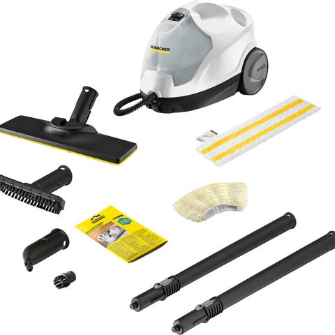 Kraftig gul Kärcher SV 7 dampvasker som rengjør og desinfiserer uten kjemikalier. Egner seg svært godt til: